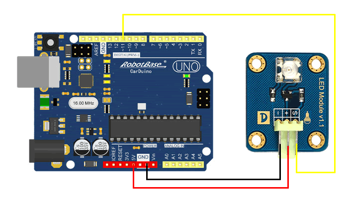 将程序上传到Arduino UNO 控制器中,按照连接示意图正确连接传感器模块,我们可以看到LED发光模块点亮1秒,熄灭1秒,如此反复的交替亮灭。
