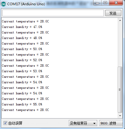 将例程上传到Arduino控制器中,并按照接线图正确进行接线,通过Arduino的串口监视器可以观察到当前环境下的温度和湿度值,实验效果如下图所示: