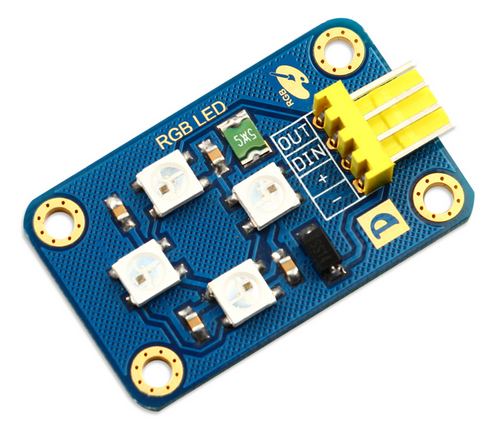 产品由 4 个全彩 WS2812 RGB LED 组成,WS2812 是一个集控制电路与发光电路于一体的智能外控LED光源。其外型与一个 5050 LED 灯珠相同,每个元件即为一个像素点。像素点内部包含了智能数字接口数据锁存信号整形放大驱动电路,还包含有高精度的内部振荡器和 12V 高压可编程定电流控制部分,有效保证了像素点光的颜色高度一致。数据协议采用单线归零码的通讯方式,像素点在上电复位以后,DIN 端接受从控制器传输过来的数据,首先送过来的 24bit 数据被第一个像素点提取后,送到像素点内部的数据锁存器,剩余的数据经过内部整形处理电路整形放大后通过 DO 端口开始转发输出给下一个级联的像素点,每经过一个像素点的传输,信号减少 24bit。像素点采用自动整形转发技术,使得该像素点的级联个数不受信号传送的限制,仅仅受限信号传输速度要求。LED 具有低电压驱动,环保节能,亮度高,散射角度大,一致性好,超低功率,超长寿命等优点。将控制电路集成于LED上面,电路变得更加简单,体积小,安装更加简便。