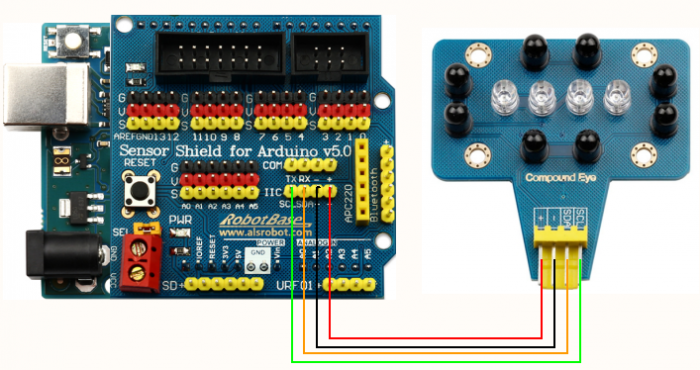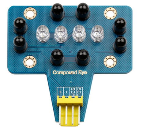 复眼传感是奥松机器人推出的复眼传感器由许多对红外线敏感的晶体管和发光二极管组成。它可以追踪20厘米范围内物体的移动。尽管传感器是一个整体,但是你依然可以读取到每一个红外线(IR)光敏晶体管的信息。复眼传感器采用IIC通讯方式,数据传输更加简便。