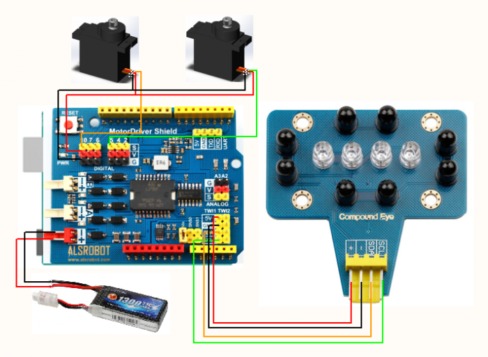 校正周围光线是通过关闭IR LED和比较数值完成的。如果要改善从复眼中读取的数值,你必须要进行校准。最好等到晚上当IR光线不存在时进行。注意红外线可以穿过关闭的百合窗,所以如果你不想等到晚上,可以去地下室,或者是没有窗户的房间,这样就可以测量数值了。将一张纸置于传感器的前方(约20厘米远),观察每支引脚的数值差异。使用纸张时数值差异不大(+/- 100)。如果某个数值过高,可以使用不透明的胶带或热收缩膜阻挡部分红外线。如果数值过低,则阻挡一部分分散到其他传感器上的红外线。