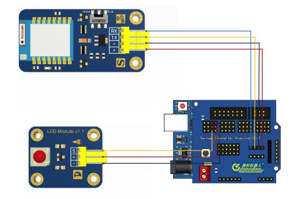 2、WiFi 模块 RX 接到控制器扩展板的 TX,TX 引脚接到控制器扩展板 RX,+ 和 - 分别接到电源的 +5V 和 GND