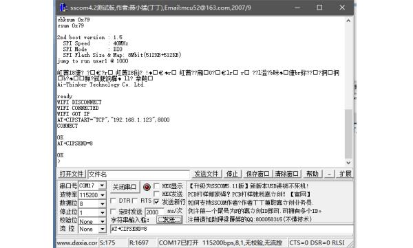 AT+CIPSTART=”TCP”,”192.168.1.5”,8081 //传入协议、服务器IP、端口