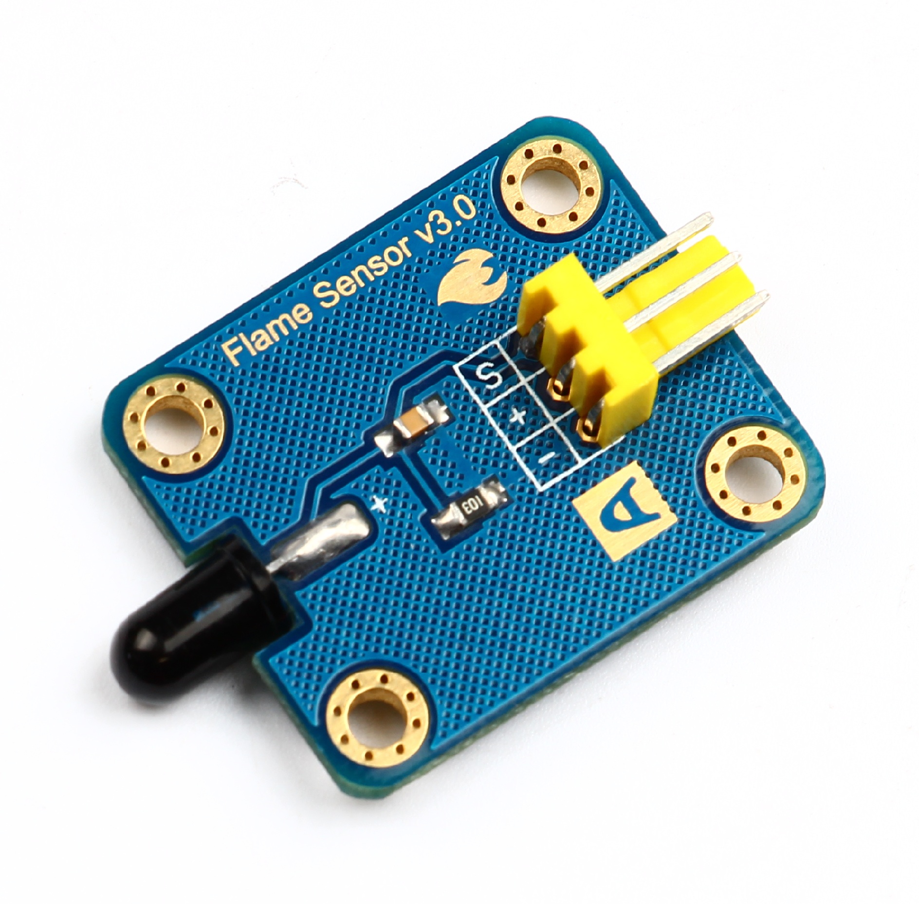 该火焰传感器可以用来探测火源或其他一些波长在760~1100纳米范围的热源,探测角度达60度,其中红外波长在940纳米附近时,其灵敏度达到最大。此火焰传感器在灭火机器人比赛或者搜救机器人比赛中起着非常重要的作用,它可以当作机器人的眼睛来寻找火源或光源足球,结合Arduino控制器与传感器扩展板,可以用来制作灭火机器人、足球机器人等。火焰传感器探头工作温度为-25摄氏度~85摄氏度,在使用过程中一定要注意火焰传感器探头离火焰的距离不能太近,以免造成损坏。