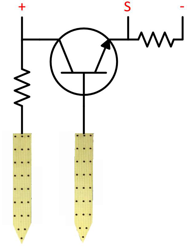 土壤湿度传感器是一种通过判断土壤中水分含量的多少来判定土壤的湿度大小的传感器。如图所示,当土壤湿度传感器探头悬空时,三极管基极处于开路状态,三极管截止输出为零;当插入土壤中时由于土壤中水分含量不同,土壤的电阻值就不同,三极管的基极就提供了大小变化的导通电流,三极管集电极到发射极的导通电流受到基极控制,经过发射极的下拉电阻后转换成电压。